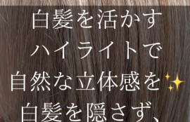 白髪部分にハイライトを入れることで、白髪を自然なアクセントとして活かせます!全体的に立体感が出て、髪のボリュームアップ効果も期待できます。ハイライトもブリーチを使わずに明るさを出す事は可能です!なりたい色味に応じて調合し希望のカラーを楽しむ事ができます。
