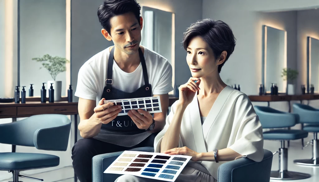 お客様の理想を正確に把握するために、カラーサンプルやスタイル写真を用いながら仕上がりのイメージを共有します。「こんな感じにしたかった」という思いを大切に、納得いただける仕上がりを目指します。