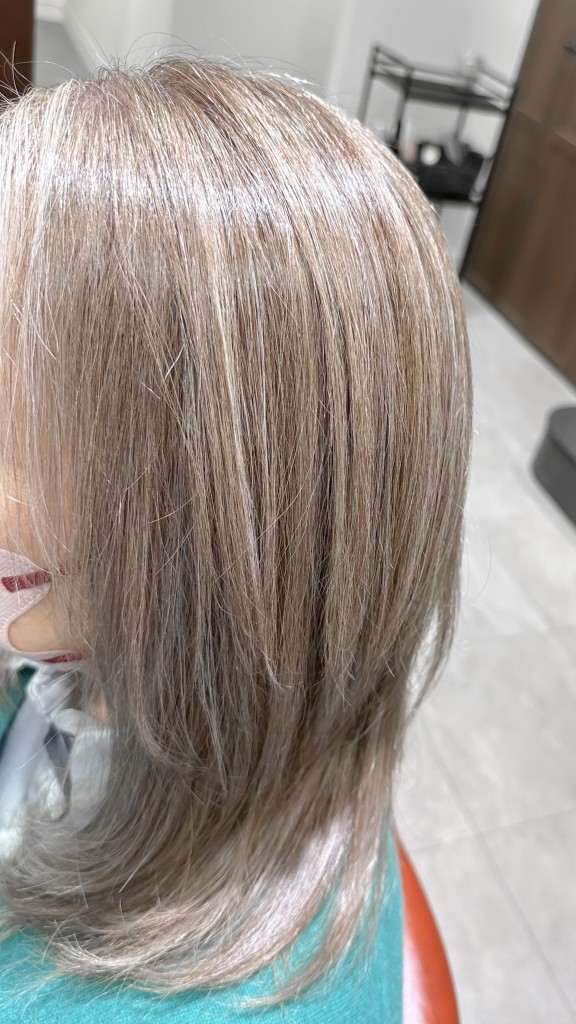 従来の白髪染めは、根元が伸びると白髪がくっきりと目立ちやすくなりますが、ハイライトを入れることで、白髪をぼかしながら明るく自然なニュアンスを楽しぬ事ができます。