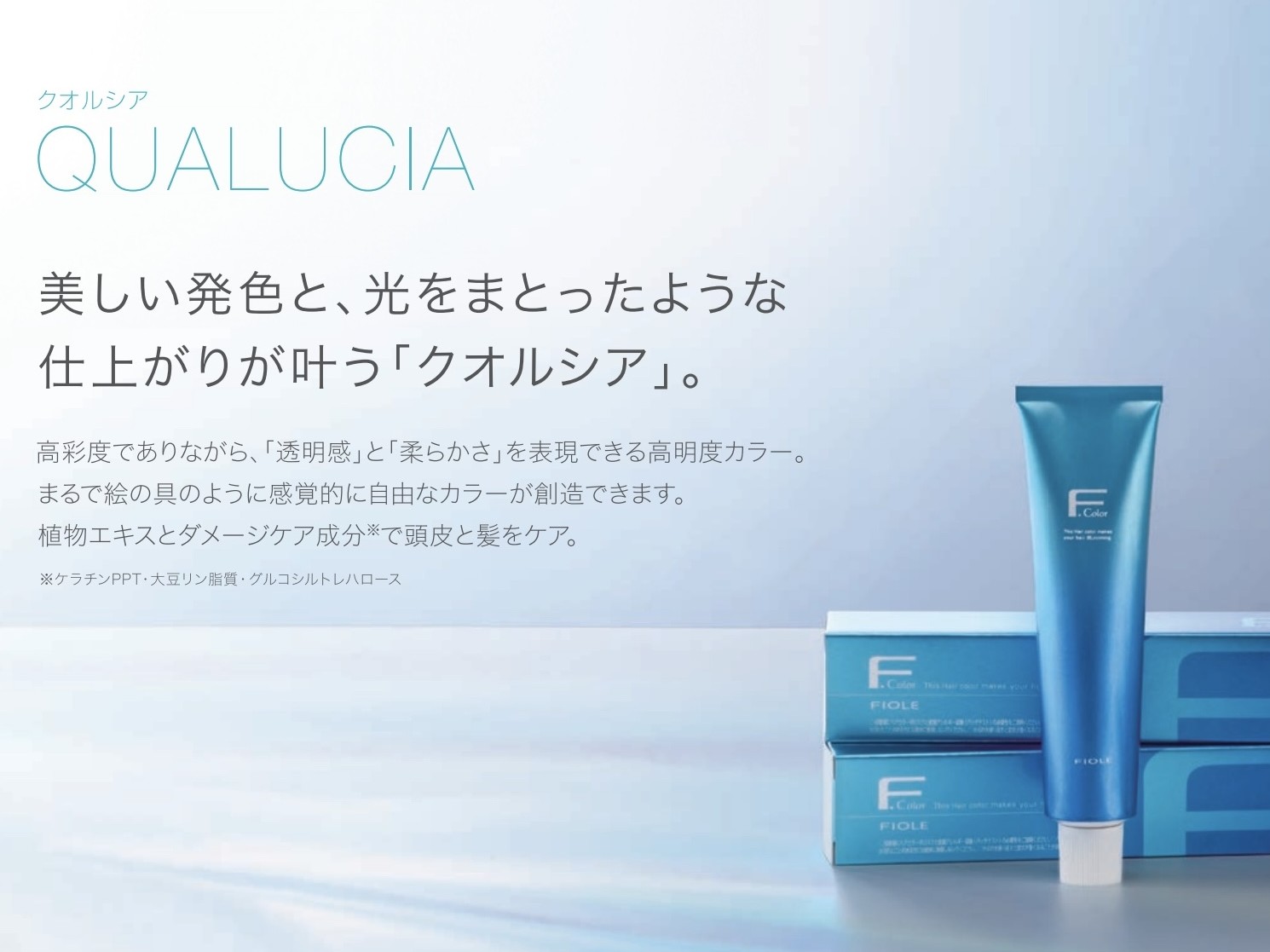 FIOLEカラーは、植物抽出エキスと毛髪保護成分を配合し、黒髪もグレイヘアも美しく艶やかに染め上げるクリエイティブな総合カラーです。「クオルシア」シリーズは高彩度で透明感と柔らかさを表現し、ヘアカラーの可能性を広げます。ビビッドカラーを中心に、高明度・高彩度の色構成で、ブリーチ後や明るい髪にも対応。植物エキスとダメージケア成分で頭皮と髪をケアしながら、鮮やかで深みのあるカラーから柔らかく透け感のある仕上がりまで、多彩なスタイルを実現します。まるで絵の具のように自由な感覚で理想の色彩を創造できます。