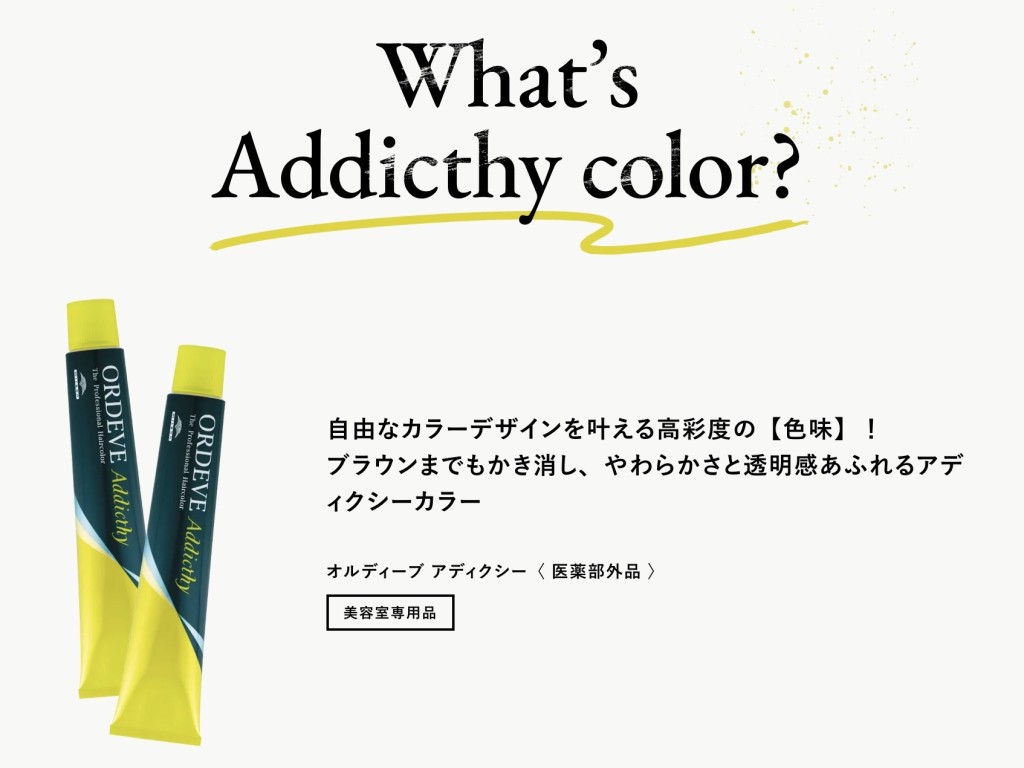 オルディーブ アディクシーは、高彩度の青色をベースに、赤味やブラウン味を打ち消し、透明感のあるクリアなカラーを実現するヘアカラーです。特に黒髪特有の重さや硬さを軽減し、中明度で自然な透明感を引き出します。シンプルな染料構成と独自の発色調整成分により、過度に髪を明るくする必要がなく、効率的な染色が可能です。また、「リン酸ジセチル」を配合することで、染料を髪の内部へ効率的に浸透させ、芯から美しい発色を叶えます。クリアブルーベースが生み出す透明感と高発色で、ブラウンにとらわれない自由なカラーリングを楽しむ事ができるカラー剤です。